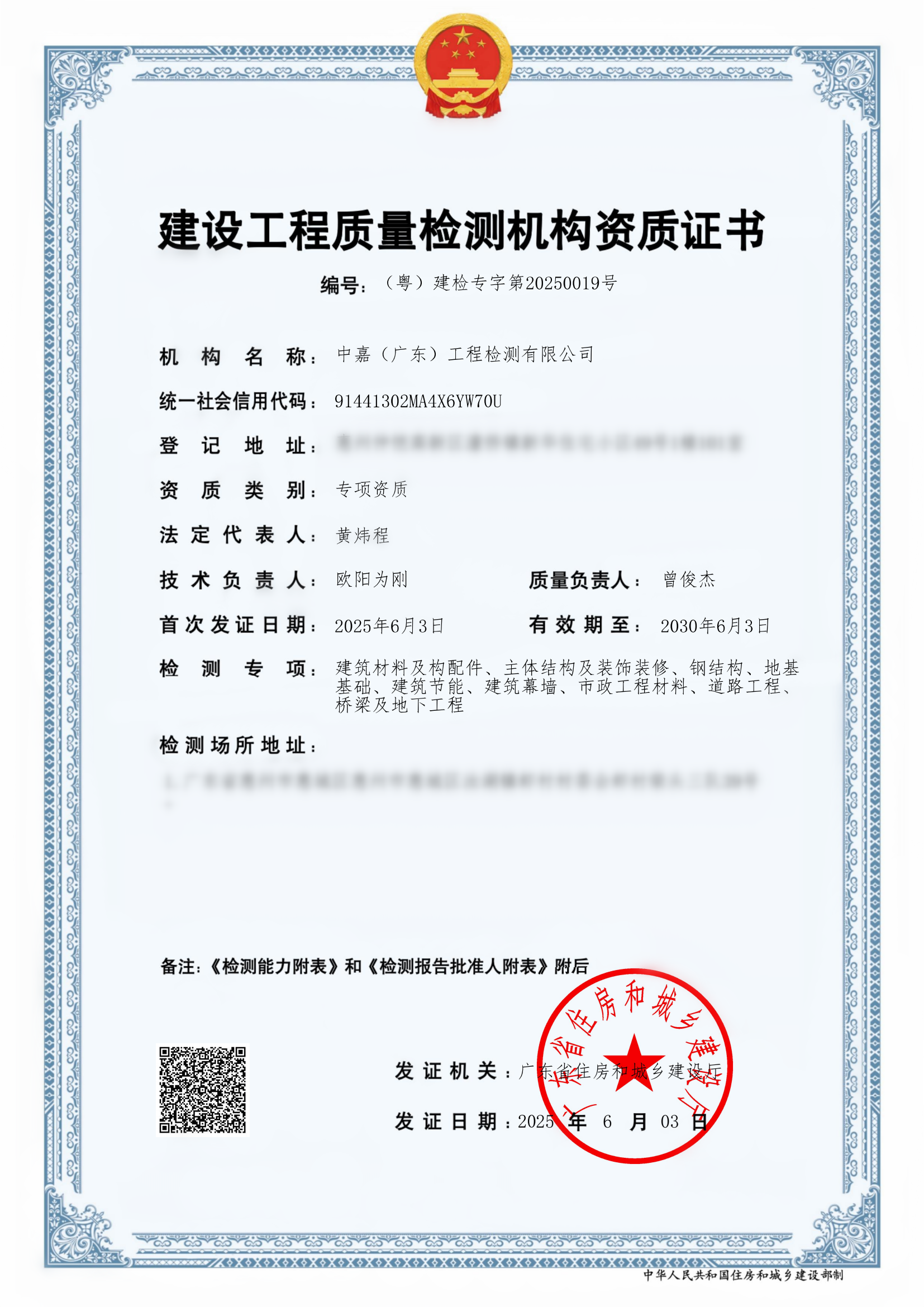 近日,中嘉(廣東)工程檢測有限公司成功獲得惠州市首張建設工程質量檢測機構資質證書,資質范圍全面覆蓋建筑材料及構配件、主體結構及裝飾裝修、鋼結構、地基基礎、建筑節能、建筑幕墻、市政工程材料、道路工程、橋梁及地下工程九大全項領域。標志著中嘉檢測在建設工程質量檢測領域的綜合實力再上新臺階,開啟了建設工程質量檢測新篇章。